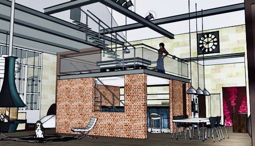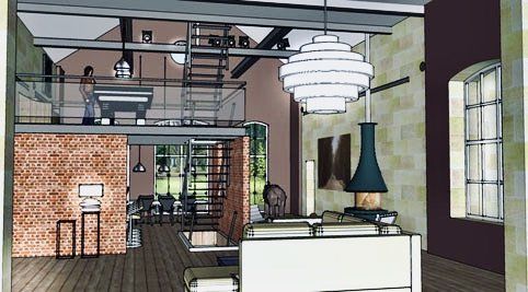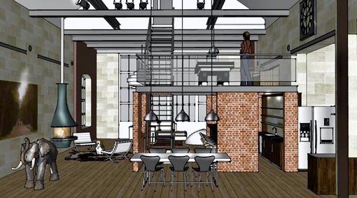 Exemple de projection 3D possible pour en faire un lieu de vie style loft à l'aspect brut et au style industriel.